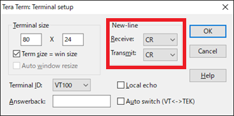 Variable Value Baud rate 115200bpsData 8 bitParity noneStop 1 bitFlow control noneSelect the Setup > Terminal to set the new-line code.