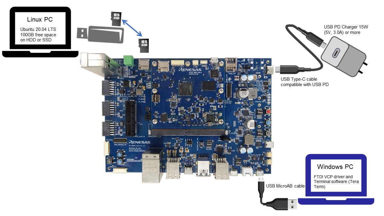 USB serial cable | It is used to connect the PC and the EVK and get the console | Included with RZ/G2UL Evaluation Board Kit (EVK) |