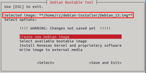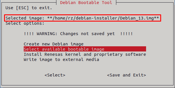 make_bootable_image.sh: Contain the main menu selection.install_qemu.sh: Install QEMU version 8.2.9.run_qemu.sh: Start QEMU VM to install Debian 13 to the image.install_renesas_sw.sh: Set up chroot environment to install software packages.install_packages_debian.sh: Install .deb packages.write_image.sh: Write the image to an external media (e.g., SD card).settings.txt: Contain user settings.