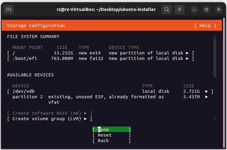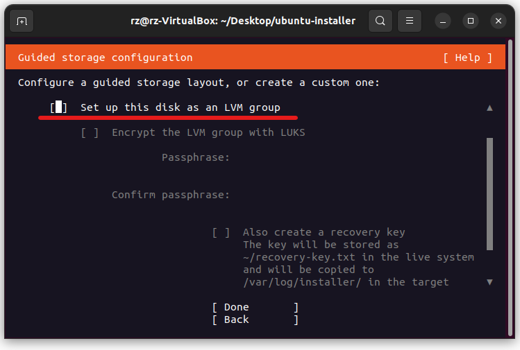 Deselect Set up this disk as an LVM group and press Done to continue.