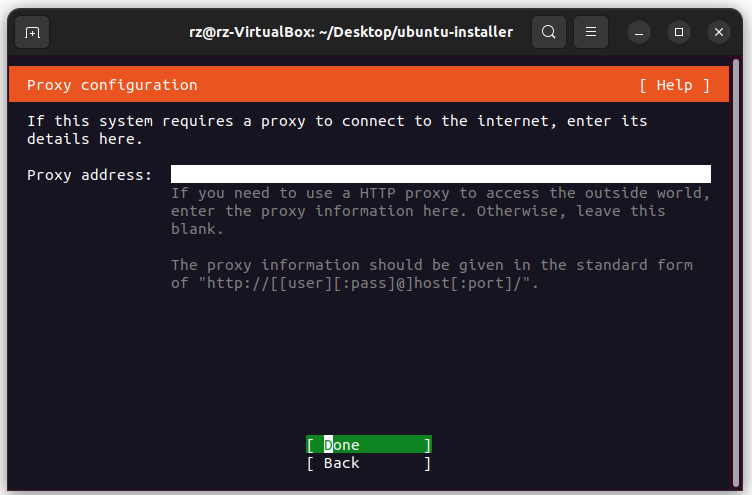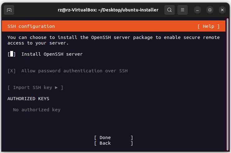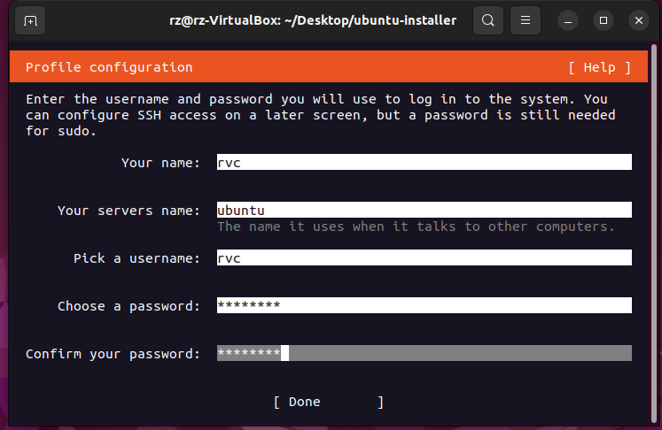 Enter username (e.g., user) and password for the administrator account, then press Done.