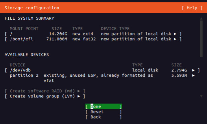 - Press "Done" to confirm the partitions of the "/dev/vdb" disk.