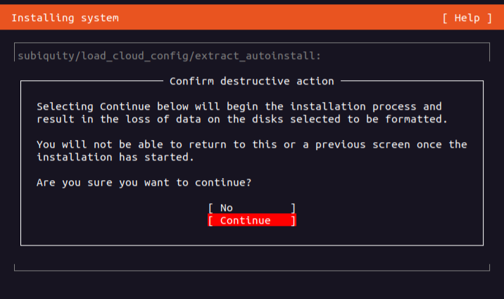 - Select "Continue" to finish partitioning and write changes to the "/dev/vdb" disk.
