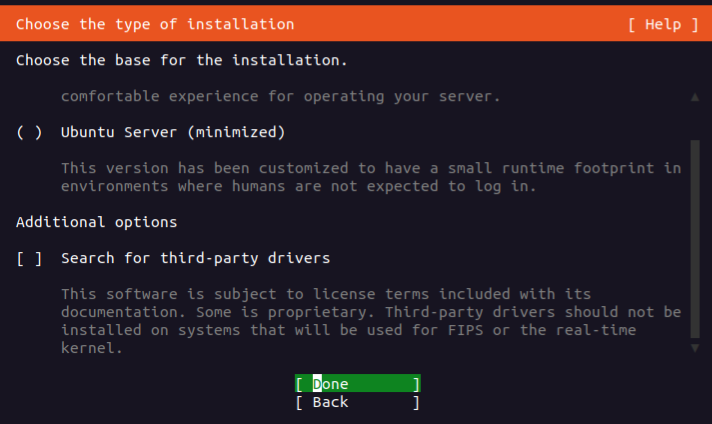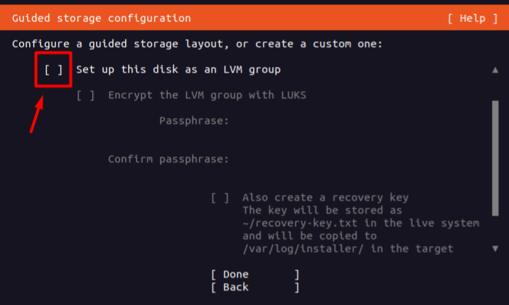 - Deselect "Set up this disk as an LVM group" and press "Done" to continue.