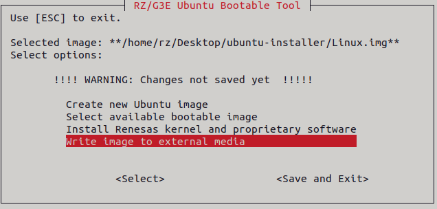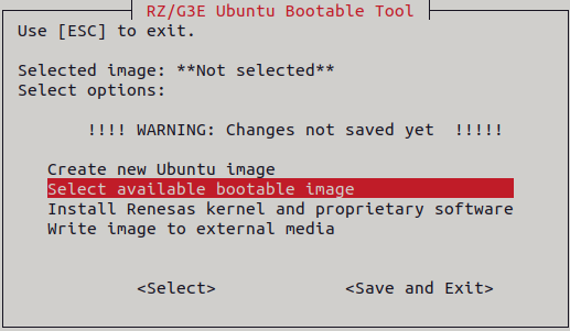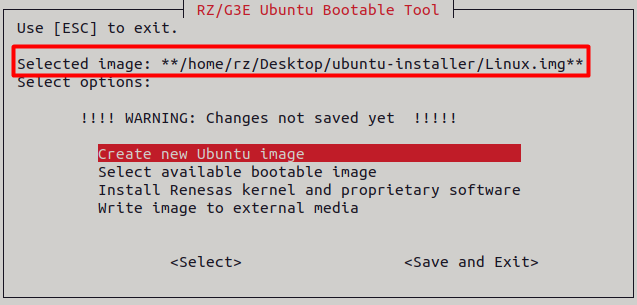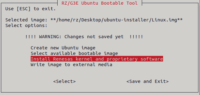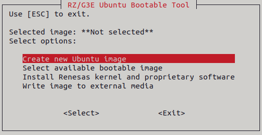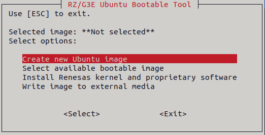 The RZ/G3E Ubuntu Bootable Tool is a Bash script designed to streamline the creation and customization of bootable ARM64 Linux disk images for Ubuntu 24.04 on the RZ/G3E platform. It offers a user-friendly, menu-based interface using whiptail and zenity, making it easy to create, and apply custom configurations. The tool also supports writing images directly to an external media (e.g., SD card).