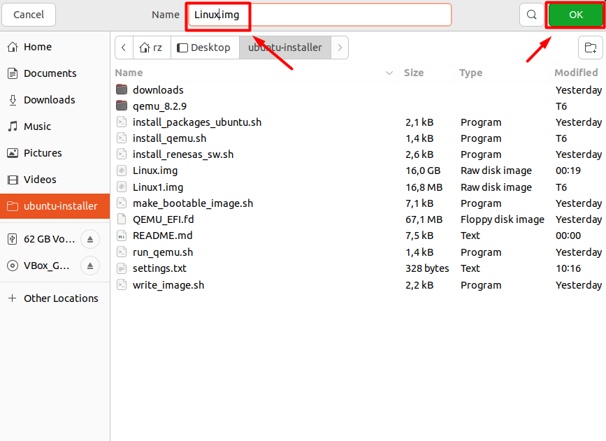 - Use the file dialog to name the image (e.g., Linux.img) and select its location. Next, press "OK" to confirm.