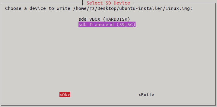 - Select the microSD card (e.g., "sdb Transcend (59,5G)"). Press "Ok" to continue.