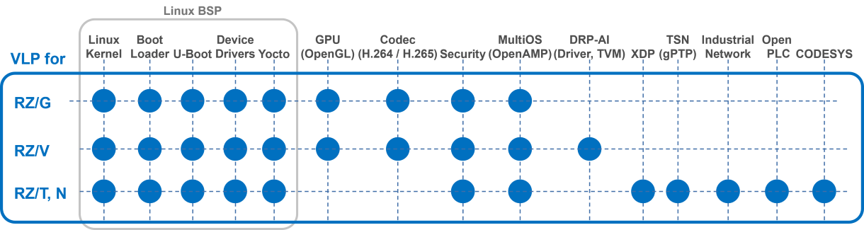 Renesas provides the basic software required for the industrial segment as the verified software package. Renesas also provides the multimedia package for installing H.264/H.265 Video codec and graphics (OpenGL ES) function into the RZ MPU BSP (Board Support Package). Please go to the page from the link that indicates the version of VLP in the table below, download the package and use it.