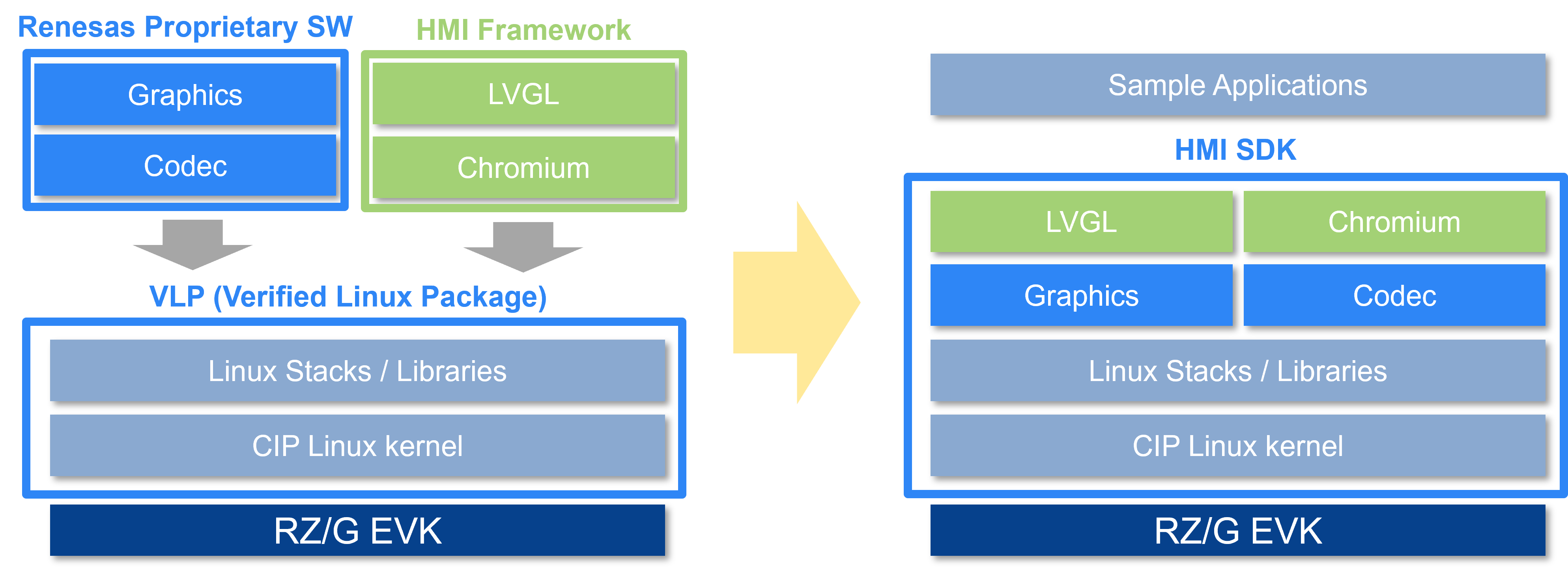 The left diagram in the figure shows the development method without the HMI SDK. Users need to download and integrate necessary software packages such as VLP (Verified Linux Package), graphics library, codec library, and HMI framework or libraries. The right diagram in the figure shows the development method with the HMI SDK. The HMI SDK is provided as an 'all-in-one package'. Users do NOT need to look for appropriate software and worry about how to integrate all modules.