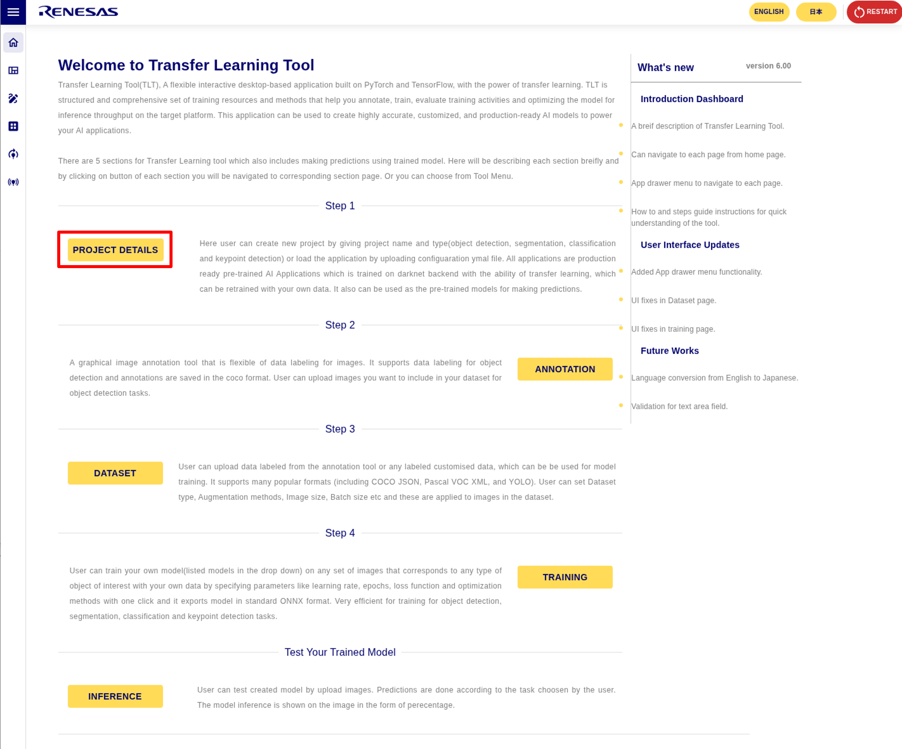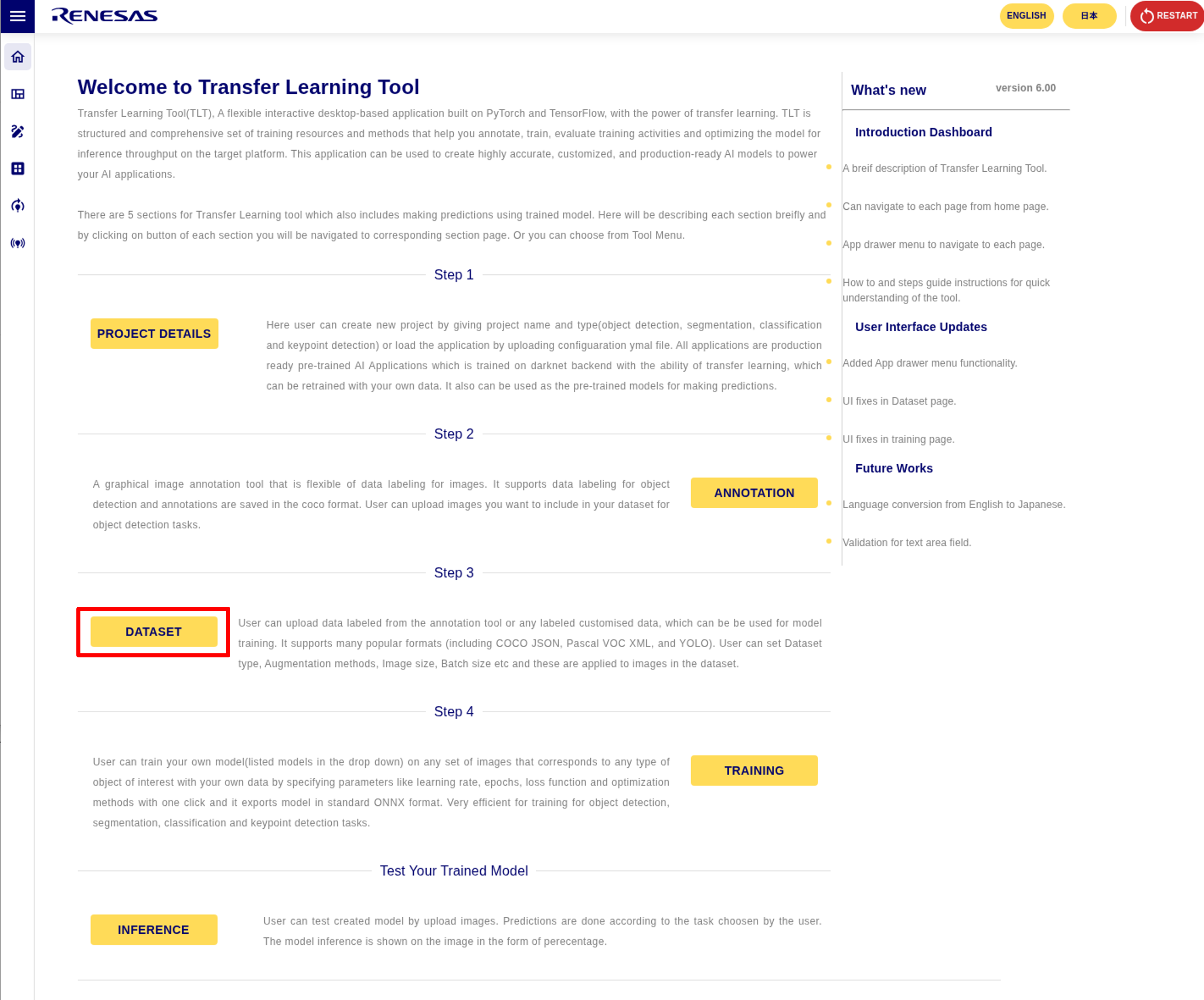 RZ/V AI Transfer Learning Tool has 5 Sections.