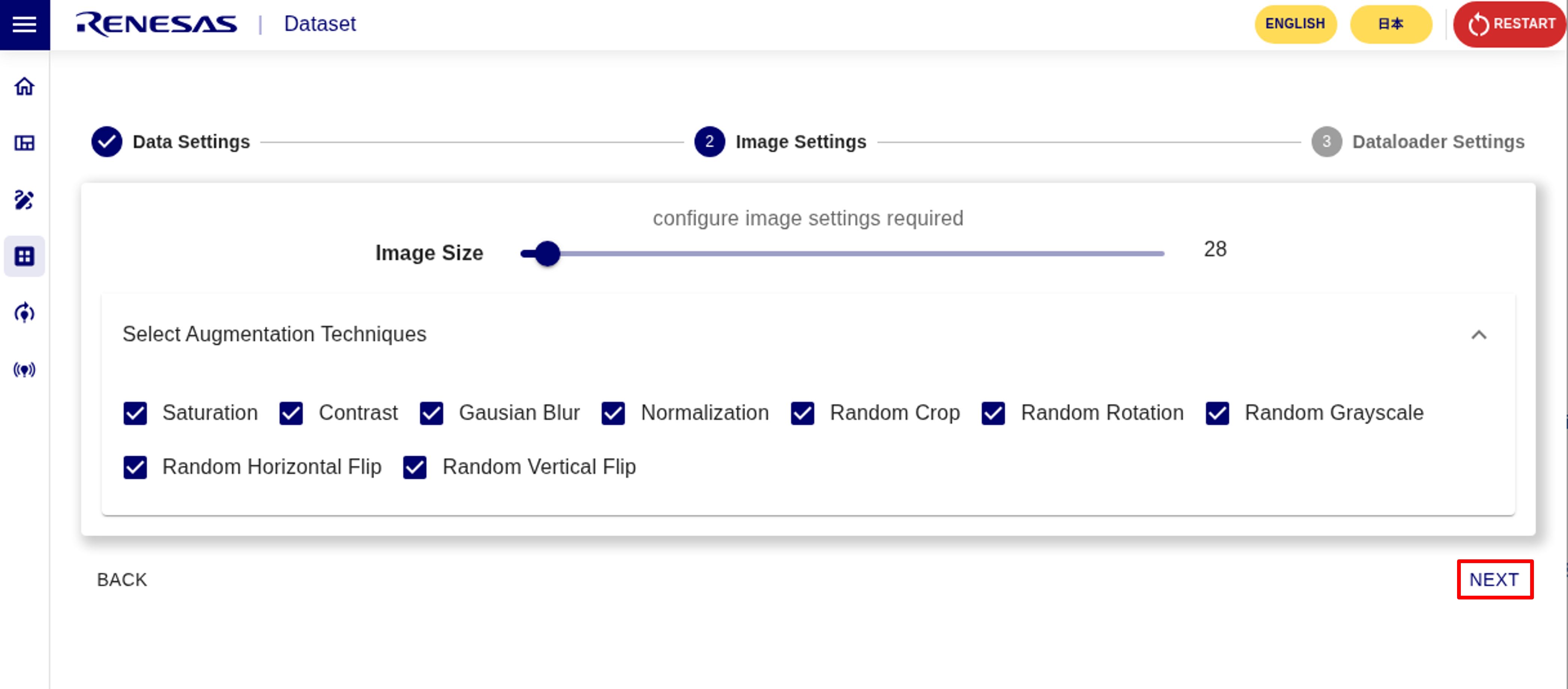 5. Set the image size to input to the model and select Augmentation.