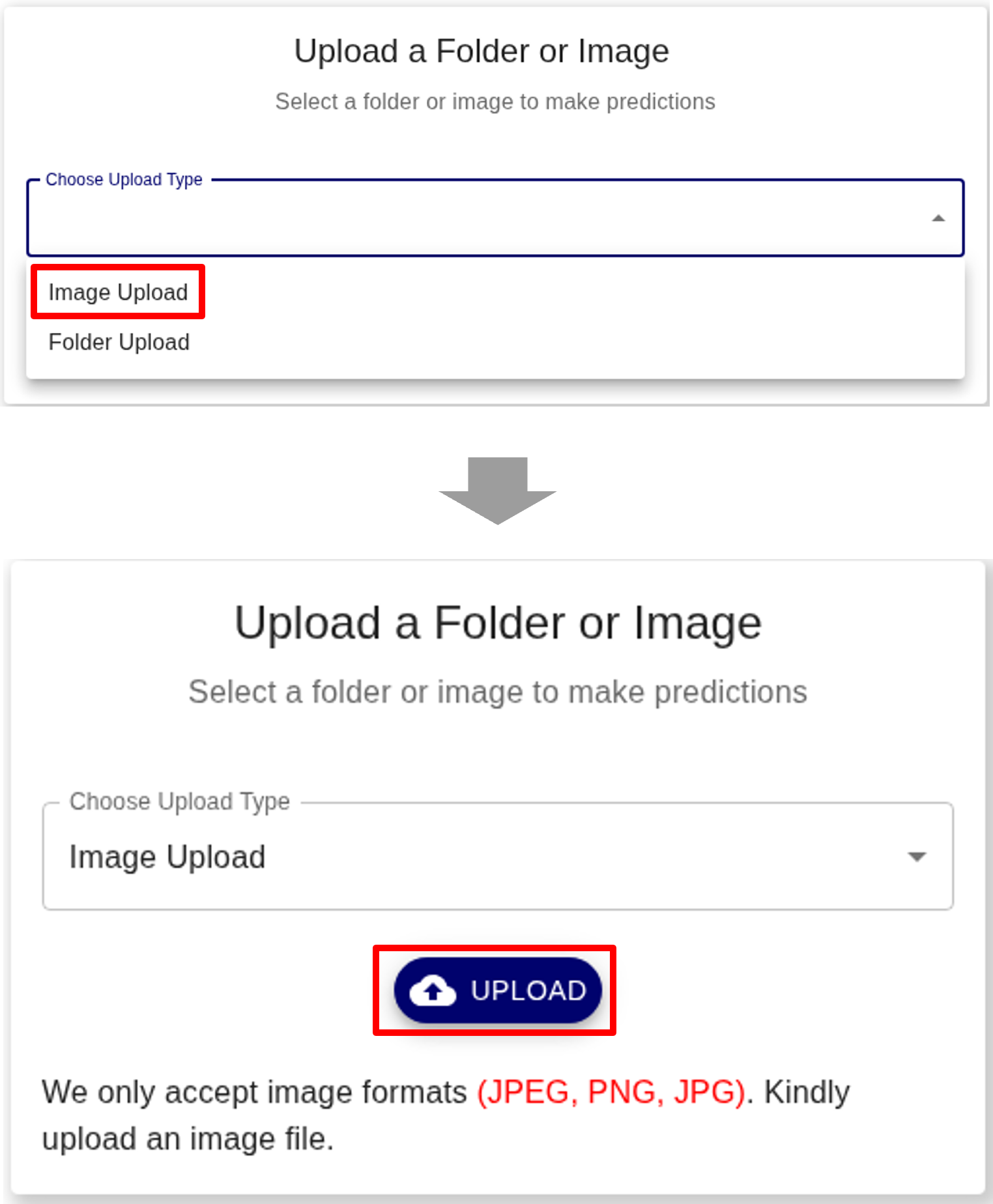 2. Click Choose Upload Type and UPLOAD to select a test image.