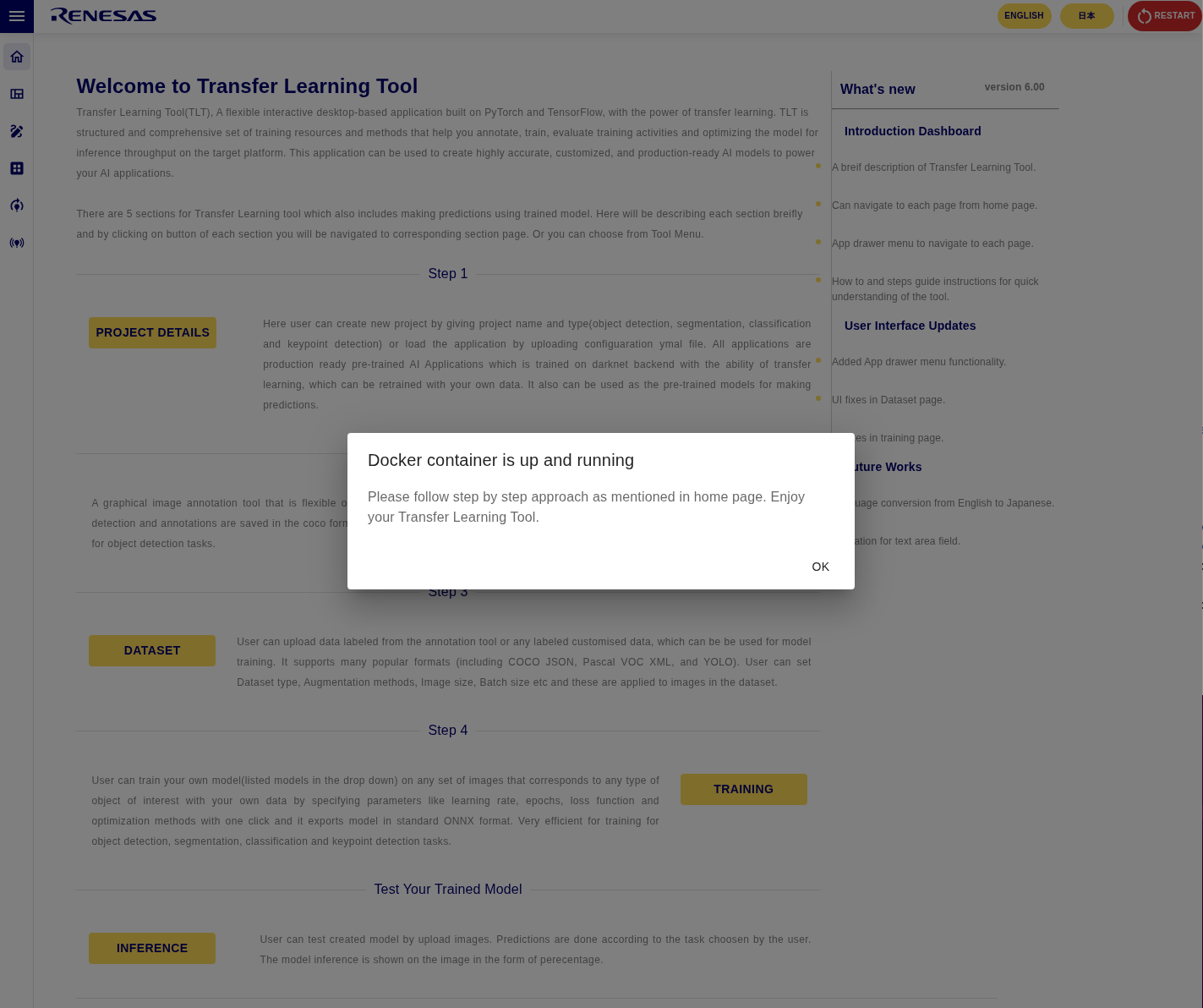 Note If you use AI Navigator of e2 studio, the installation procedure is different, so please refer to AI Navigator Quick Start Guide. In AI Navigator v2.0.0 (latest), RZ/V AI Transfer Learning Tool v4.00 will be automatically installed, so please see the documentation for previous version.