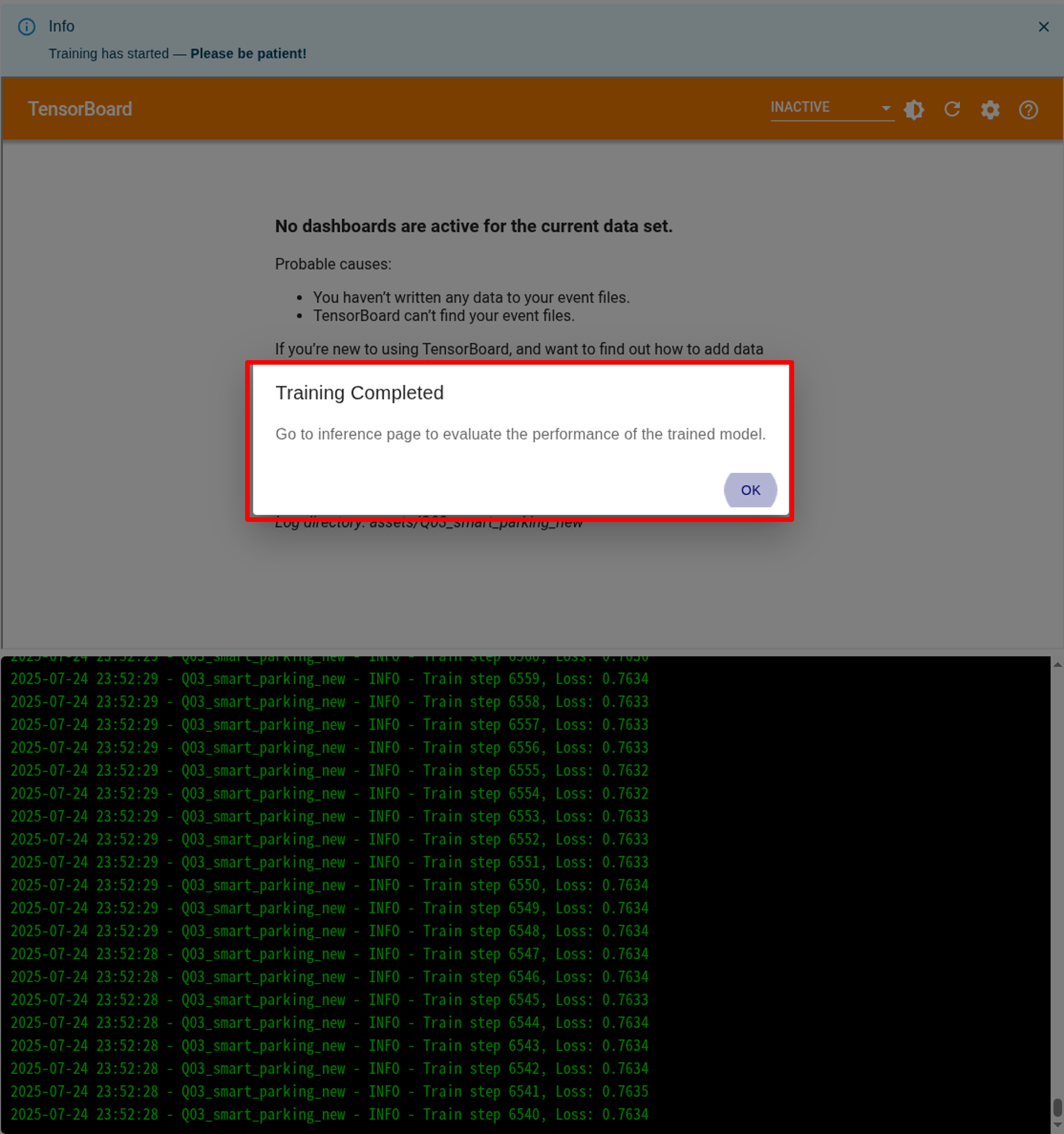 3. When Training Completed!!! pop-up appears, click OK to complete the training.