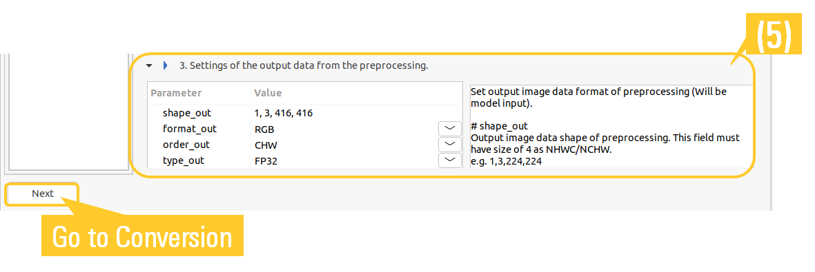 The pre-processing parameters are already set by default and do not need to be changed. Click "Next" to proceed to the next step, AI model conversion.